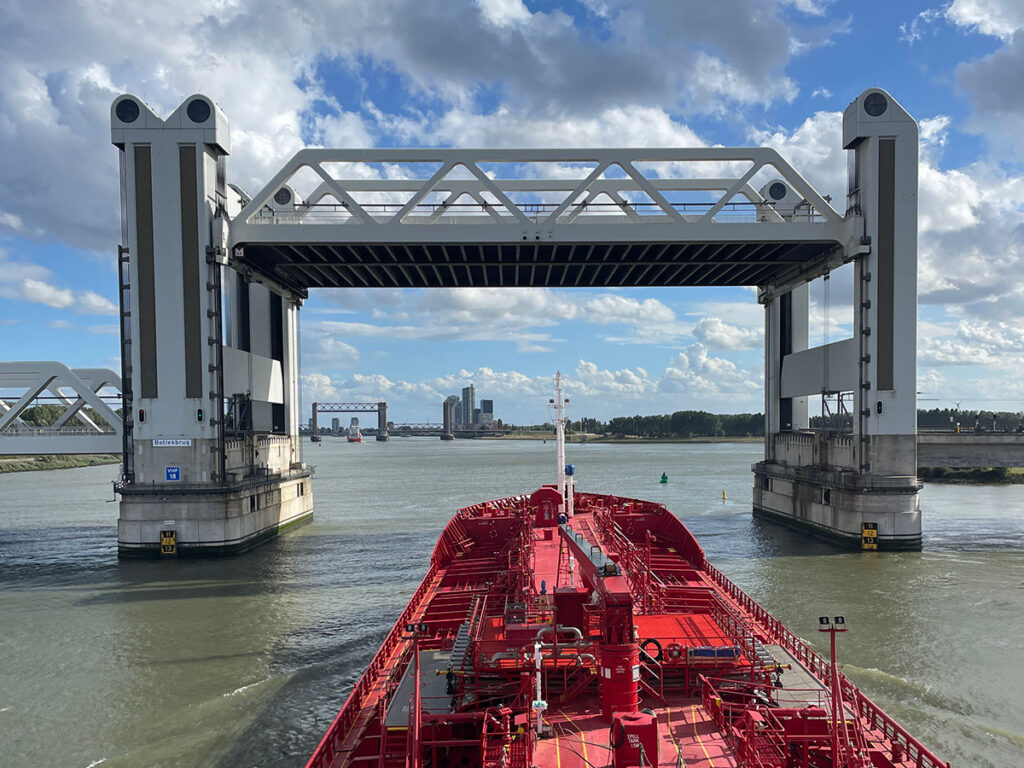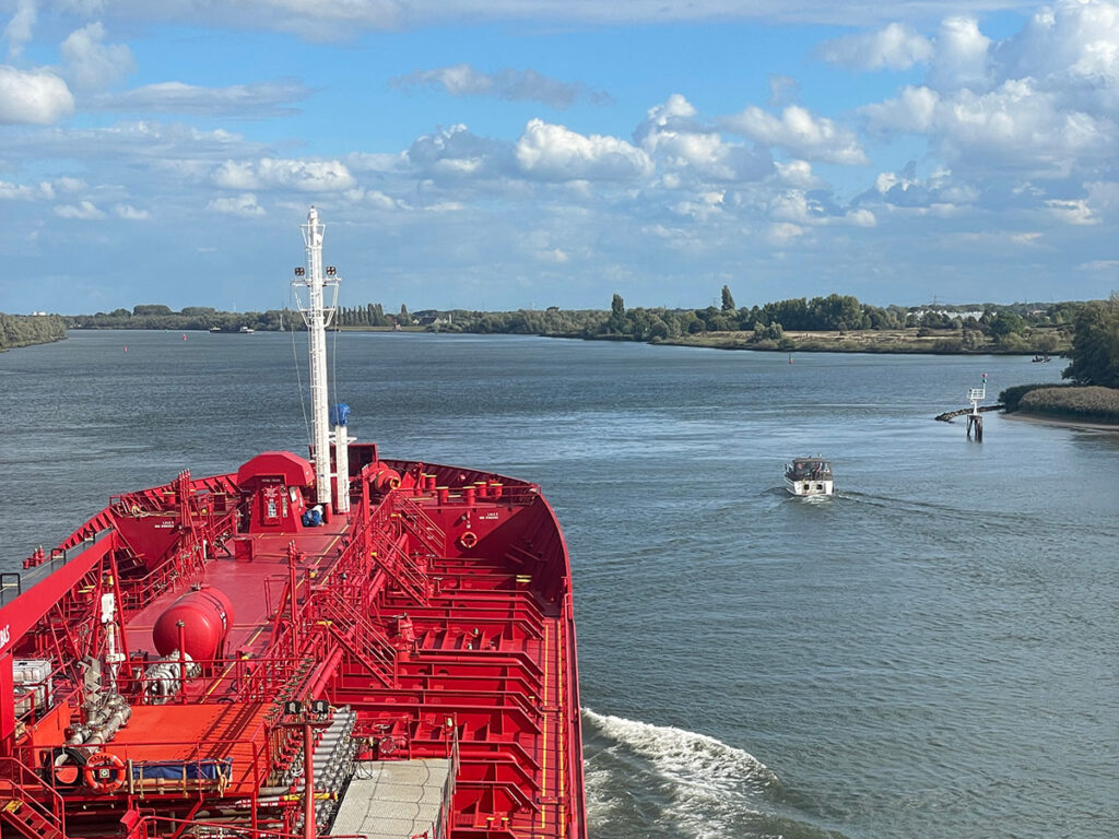 Dit schip is een geladen olie- en chemicaliëntanker van 140 bij 20 meter en met een geladen diepgang van 6,8 meter. Noorse bouw en varend onder Noorse vlag. De tanker is uit 2000, maar supergoed onderhouden, overzichtelijk en schoon. Anders dan vanmorgen geeft de loods hier niet de orders aan de kapitein, maar stuurt hij het schip zelf. Er zijn geen sleepboten nodig, deze tanker is namelijk wél gebouwd voor manoeuvreren. De rompvorm is anders, hij heeft een redelijk goede achteruit, het roer kan beter sturen dankzij een flap, de boegschroef is krachtiger en door de verstelbare schroef is het vermogen beter regelbaar.