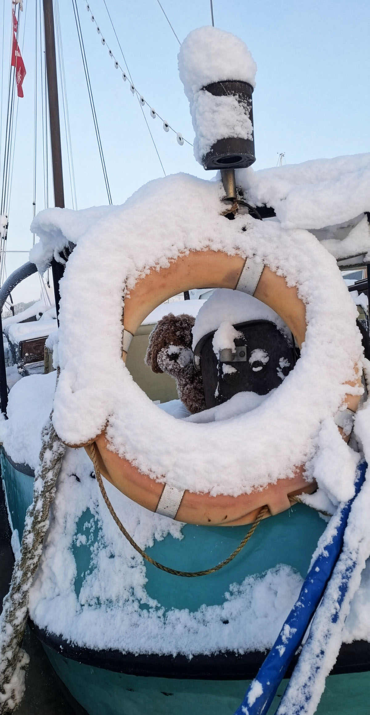 Hondenliefhebbers weten hoe gek hun huisdier kan zijn op sneeuw, zo ook hier op de tjalk Nooit Volmaakt 1929 van Pieter Foppen!